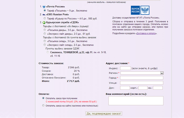 Даллее вводим СПОСОБ ДОСТАВКИ.. ИНДЕКС... РЕГИОН..ГОРОД..УЛИЦУ.. ДОМ...КВАРТИРУ и нажимаете ПОДТВЕРЖДЕНИЕ ЗАКАЗА..